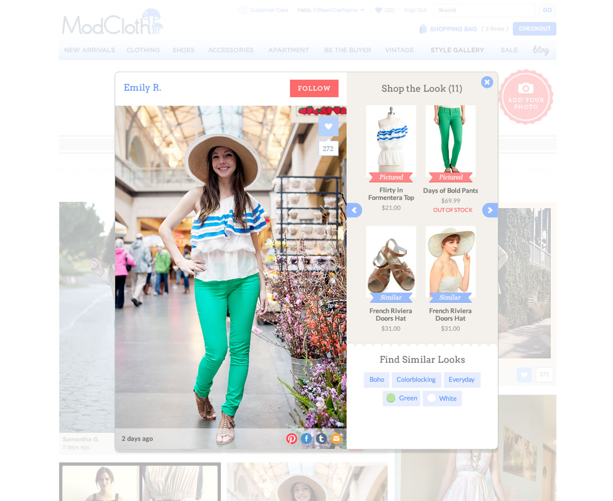 ModCloth has an amazing, devoted, adorable community that already engages with our brand in a variety of ways. At the time of this project, our customers were connecting with us on our social networks (Facebook, Twitter, Instagram, Flickr) and by providing product reviews. We wanted to take this a bit further and evolve our experience to include a social shopping component that addressed our customer’s needs. Our goal was to figure out what a social, community-driven experience could mean for ModCloth which at this point, was very broad.