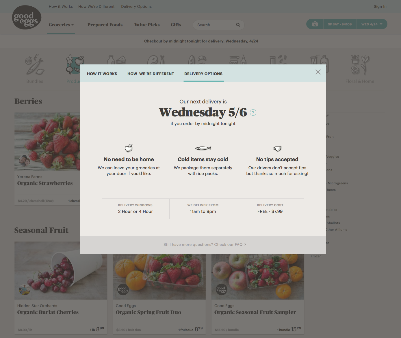 We came up with a few new concepts and did another round of user testing which resulted in a huge improvement on comprehension and understanding of how Good Eggs worked. Our goal was to answer the common questions like, “Do you deliver to me? Is there an order minimum? Do I need to be home to receive my groceries?” A couple concepts that we felt we could pursue were introducing a set of modals accessible from the top nav that would explain how Good Eggs worked. We also wanted to be thoughtful about where a 1st time customer landed and tried out a 1st time customer homepage which doesn’t currently exist in the experience. We felt it could be disorienting to land in a market page without really understanding what Good Eggs was about and what you could do here. A homepage could tell more of a story at a glance.